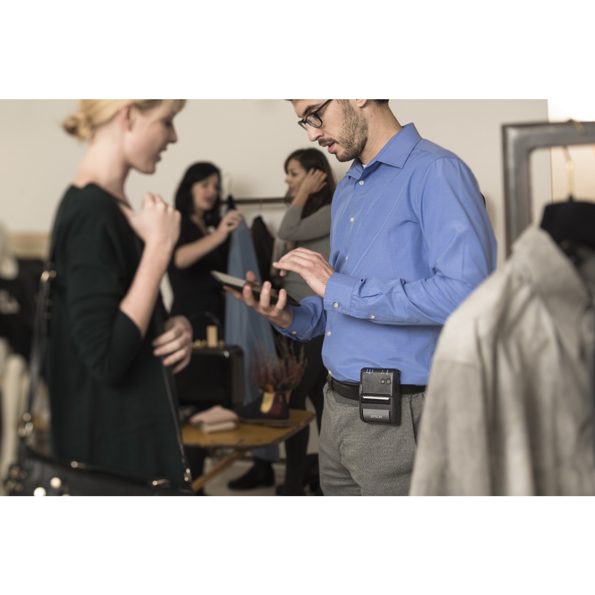 Tiskárna EPSON TM-P20 Wi-Fi má o polovinu menší velikost než naše jiné dvoupalcové modely a přibližně o dvě třetiny nižší hmotnost. Může se chlubit rychlým tiskem (až 100 mm/s) a dlouhou životností baterie, což z ní činí ideální volbu pro zaneprázdněný personál maloobchodních podniků, který řeší nákupy na prodejnách, a personál v restauracích obsluhující zákazníky. Zařízení je také opatřeno sponou na opasek pro snadné nošení.